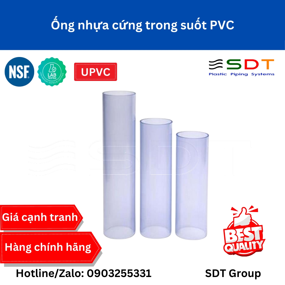 Ống nhựa trong suốt Clear PVC là lựa chọn tối ưu cho các ứng dụng đòi hỏi khả năng quan sát chất lỏng bên trong, độ bền cơ học cao và khả năng chống ăn mòn vượt trội. Sản phẩm được sản xuất từ vật liệu nhựa PVC tinh khiết, đạt tiêu chuẩn quốc tế ASTM SCH40, đảm bảo hiệu suất vận hành bền bỉ trong môi trường công nghiệp lẫn dân dụng.